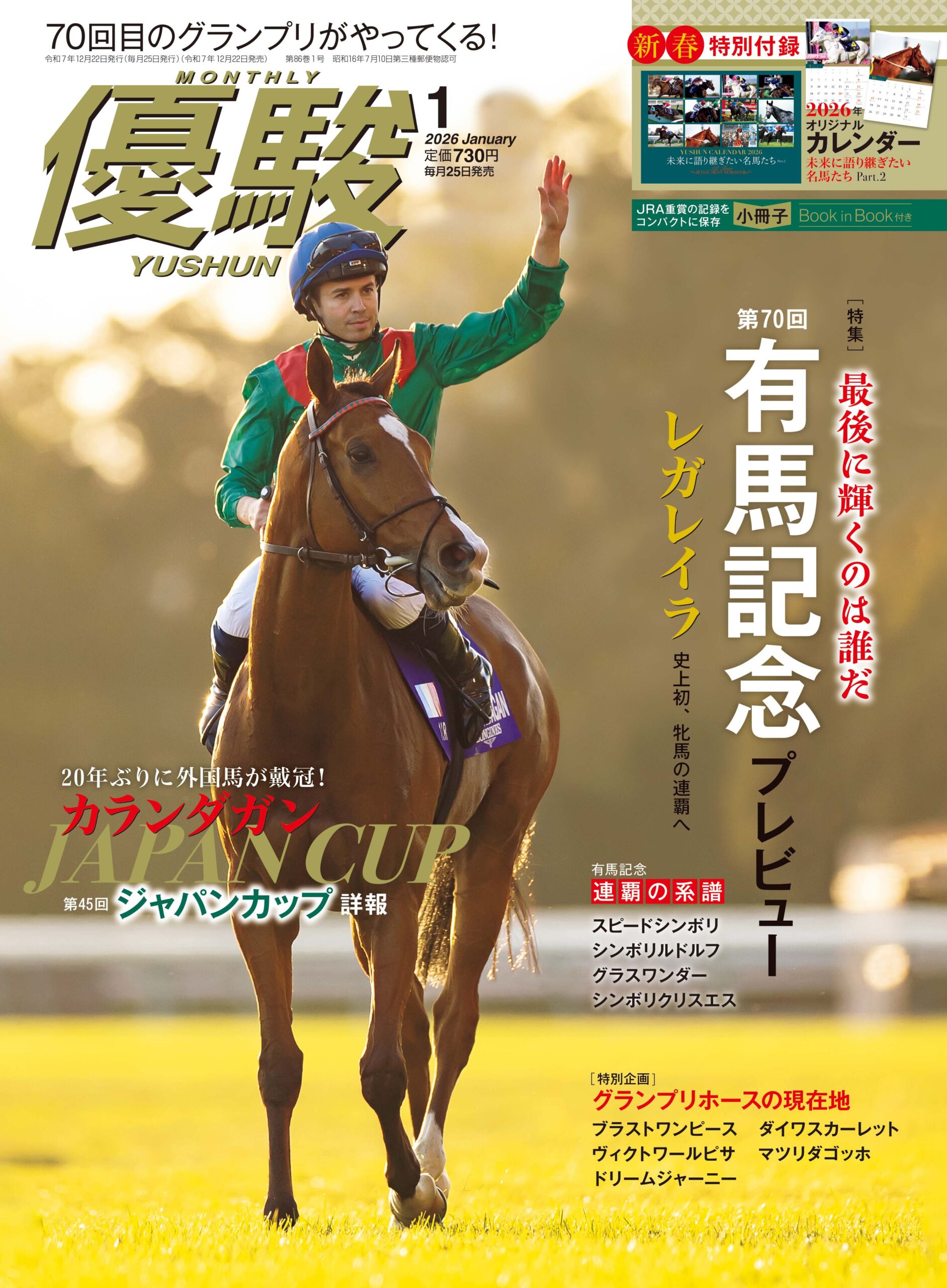 12月22日(月曜)発売のJRA機関誌『優駿』1月号は、直前に迫った第70回有馬記念を特集します。牝馬初の連覇を狙うレガレイラのほか、皐月賞馬ミュージアムマイル、宝塚記念に続く勝利を目指すメイショウタバル、ジャパンカップからの巻き返しを狙うダノンデサイルの情報をお届けします。有馬記念を連覇した4頭の記憶や、乗馬や功労馬、海外でその血を広げているグランプリホースの「いま」をレポートする読み物も掲載しています。