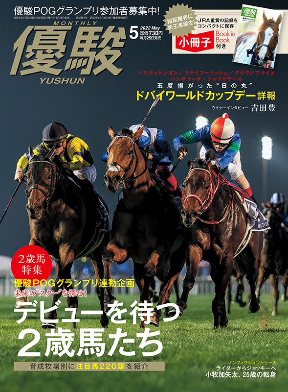 4月25日(月)発行のJRA機関誌『優駿』5月号は、日本馬が5勝を挙げたドバイワールドカップデーの現地リポートをお届けします。各レースの詳報に加え、パンサラッサでドバイターフを勝利した吉田豊騎手のインタビュー、作家の古内一絵さんの観戦記など、充実の内容です。育成牧場別にデビュー前の若駒たちをまとめて紹介する「2歳馬特集」も掲載! 全220頭を写真とコメント付きで紹介しています。こちらの特集に合わせて、今年も「優駿POGグランプリ」の新シーズン参加者を大募集します。成績上位者には豪華賞品をプレゼント! 皆さまふるってご参加ください。そのほか、大阪杯と桜花賞、高松宮記念の詳報や、天皇賞(春)の展望、馬術選手からジョッキーへと転身した小牧加矢太騎手のノンフィクション、スピードシンボリの名馬物語など盛りだくさんの内容です。綴じ込み付録小冊子「ブックインブック」には、3月5日~3月27日に行われた重賞15レースを振り返る「重賞プレイバック」を掲載しています。取り外して、記録としてぜひご活用ください!