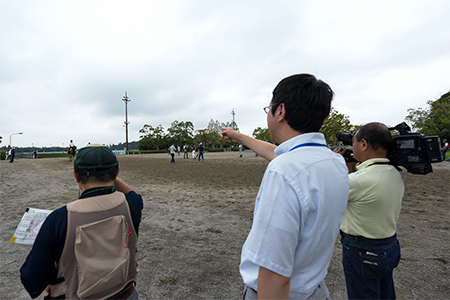 予定していた取材をすべて終え、トレセンの外へ。美浦トレセン広報会館の近くに芝生やウッドチップを敷いた静かな木陰のスペースがあるため、そこで番組のエンディングを収録します。また、少しずつ場所を変えて番組内の各コーナーの導入部も収録します。リポーターの台詞は、前夜の台本チェックで修正したものです。